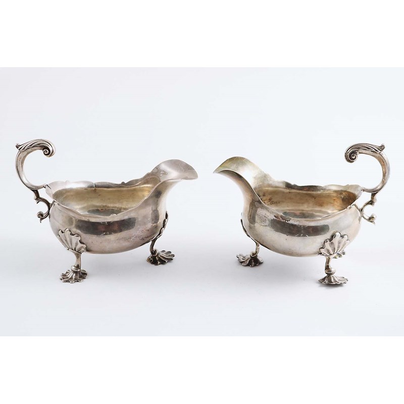 A PAIR OF LATE GEORGE II SAUCE BOATS on three shell feet with shaped rims and leaf-capped, flying scroll handles, crested, by William Skeen, London 1759; 7" (17.5 cms) long; 21.6 oz (2)