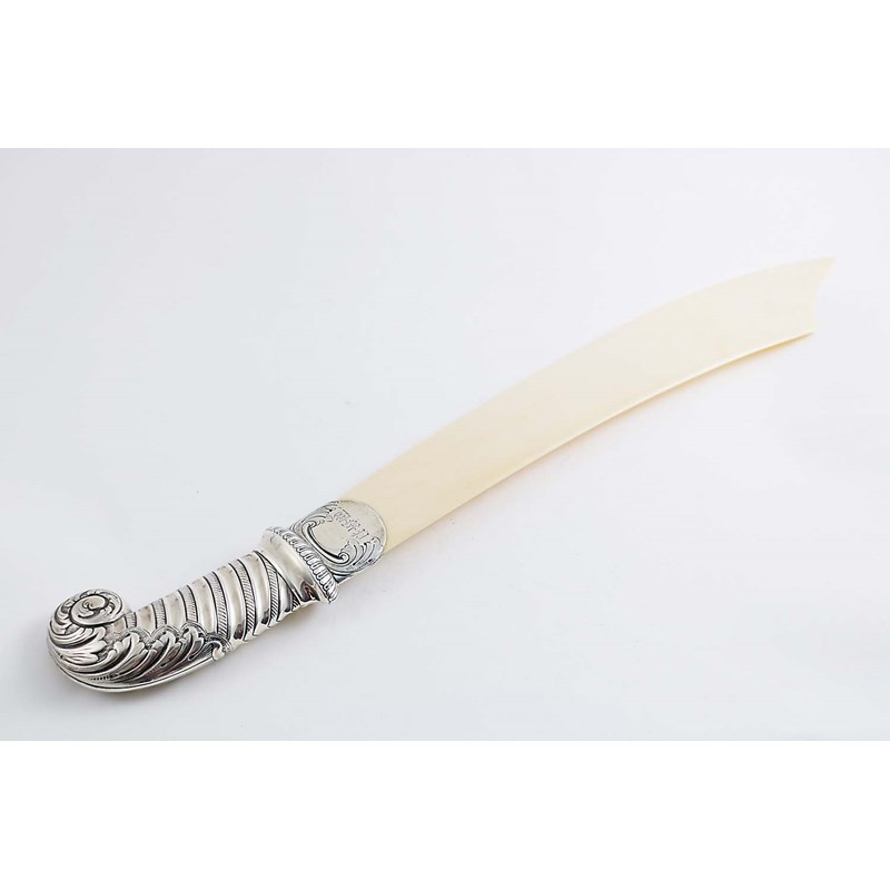 A LARGE, LATE VICTORIAN MOUNTED IVORY PAGE TURNER OR PAPER KNIFE in the form of a scimitar with an embossed hilt, initialled, by S.W. Smith, Birmingham 1890; 22.4" (56.8 cms) long
