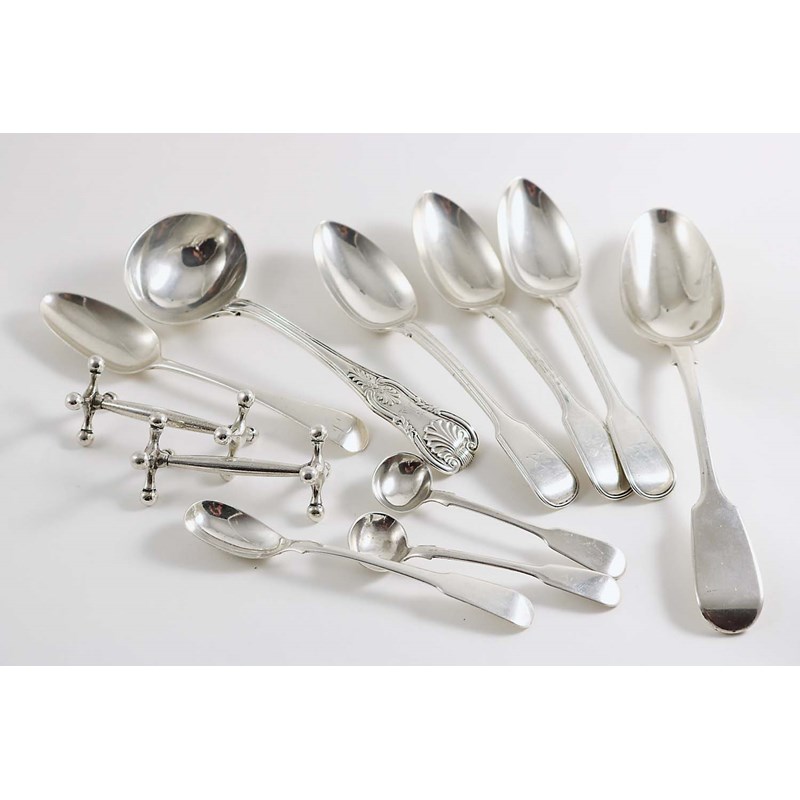 A George IV King's pattern sauce ladle, crested, a Fiddle table spoon, initialled, three Exeter-made dessert spoons, crested, a pair of knife rests, a George II dessert spoon and three condiment spoons; the knife rests 3" (7.5 cms) long; 17.4 oz (11)