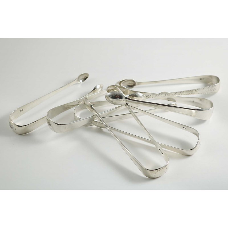 A PAIR OF VICTORIAN SUGAR TONGS & SIX PAIRS OF GEORGE III SUGAR TONGS (one crested and most initialled), mixed makers & dates; 8.7 oz (7)