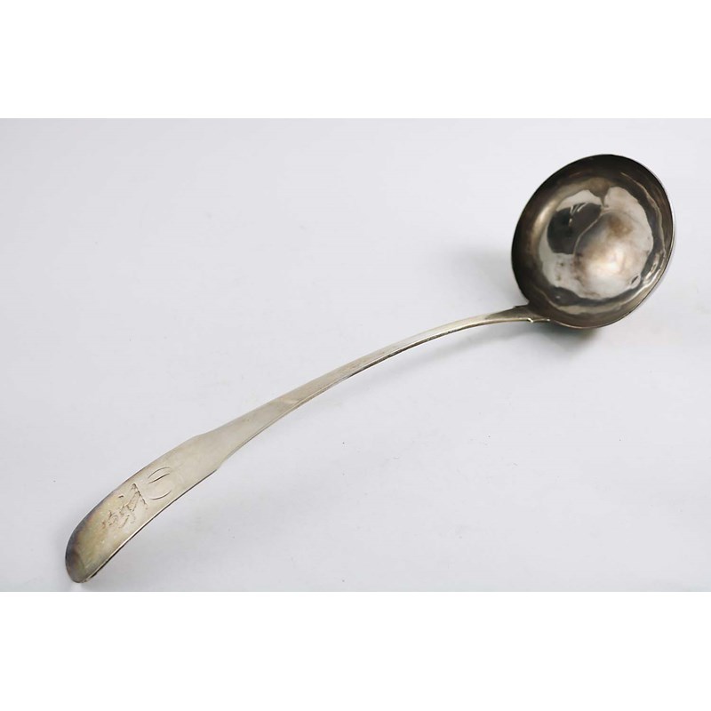 A GEORGE III IRISH FIDDLE PATTERN SOUP LADLE crested and initialled "D", by Samuel Neville, Dublin 1801 with retailer's mark of "GIBSON"; 14.5" (37 cms) long; 6.5 oz