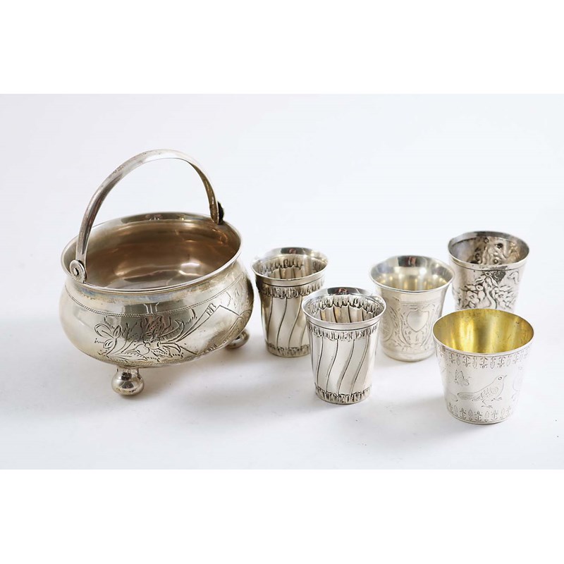 with a swing handle, Moscow 1896, a small Russian engraved beaker, two small Continental beakers and two plated beakers; the sugar basket 3.75" (9.5 cms) diameter; 7.3 oz weighable silver (6)