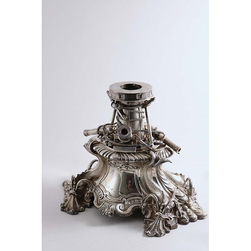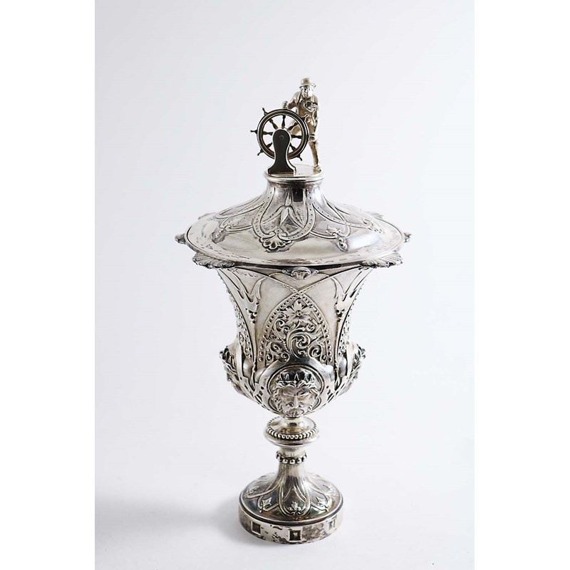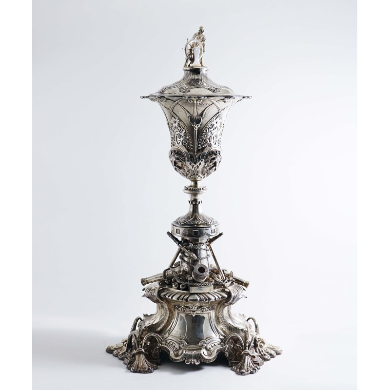 with a marine/nautical theme, modelled as wooden capstan draped with ropes and flanked by cannon, cannon balls, anchors, mortars & mortar bombs and supporting aloft a large & detachable decorative cup & cover, with a helmsman figure finial & gilt interior, the spreading base with two vacant cartouches and four stylised, spouting whales, by Edward & John Barnard, London 1861, also struck with the additional sponsors mark of George Richards Elkington (perhaps as retailer); 23.2" (59 cms) high; 115.7 oz