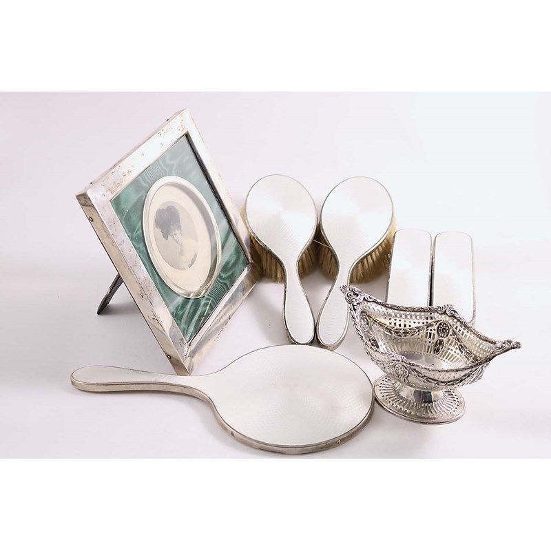 of square outline with an easel stand, by William Comyns, London 1900 together with a bonbon dish, with an inscription on the foot, by Charles Stuart Harris, London 1896 and a five-piece enamelled dressing table set; the frame 7.2" (18.2 cms) square; 4.4 oz weighable silver (7)