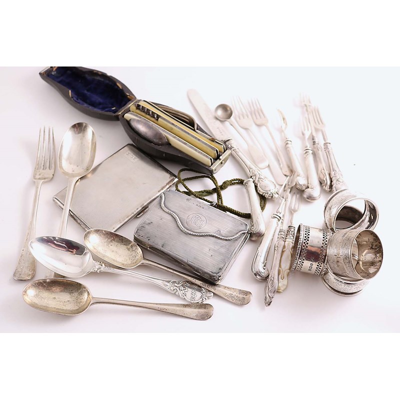 An engine-turned purse, initialled, five napkin rings (some initialled), a cigarette case, initialled and engraved inside, a plated-mounted ivory & steel campaign set in a wooden case, and a small quantity of knives, forks & spoons (some loaded); the campaign set 5.5" (14 cms) long; 21.9 oz weighable silver (lot)