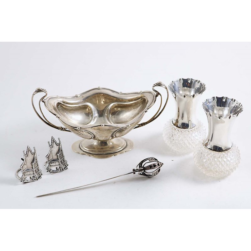 An Edwardian two-handled bonbon dish or sugar bowl, a Scottish paperknife in the form of a basket-hilted sword, a pair of Edwardian "Coronation Throne" menu holders, and a pair of late Victorian mounted cut-glass scent bottles (lacking stoppers); the paper knife 7.2" (18.2 cms) long; 9.25 oz