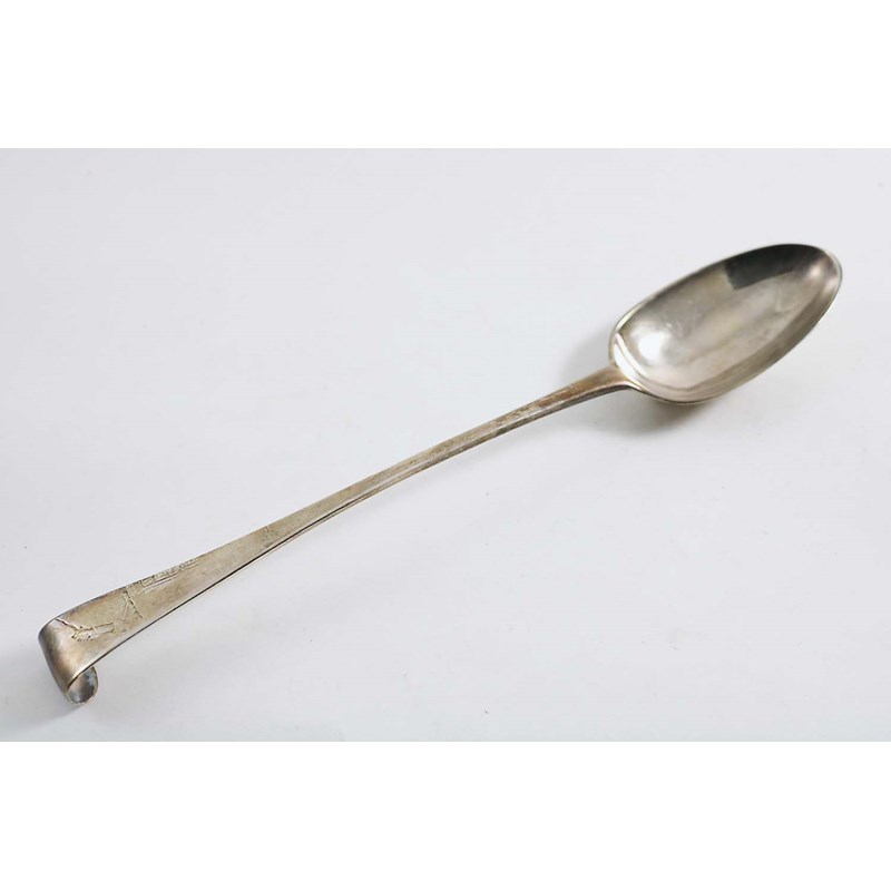 A LATE GEORGE II IRISH HOOK-END BASTING SPOON crested, by Christopher Skinner, Dublin 1759; 11.5" (29 cms) long; 3.8 oz
