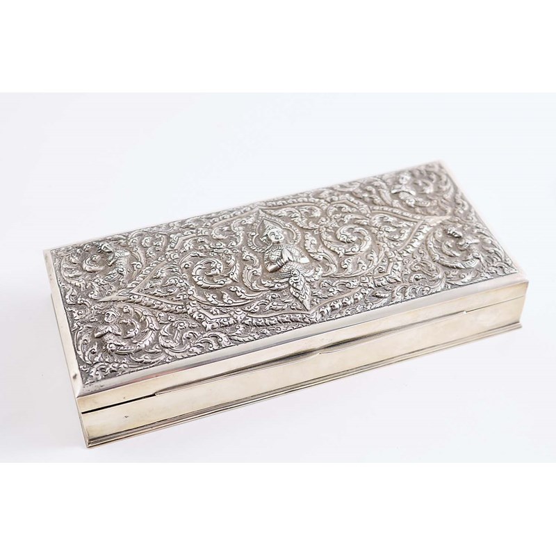A LATE 20TH CENTURY THAI CIGARETTE BOX rectangular with an embossed cover, the interior with a polished wood lining and an applied plaque, inscribed, c.1967; 8.6" (22 cms) long