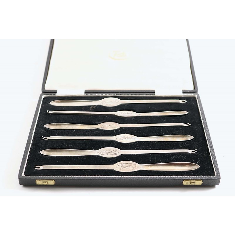 A MID 20TH CENTURY CASED SET OF SIX LOBSTER PICKS by Charles Boyton & Sons, Sheffield 1959; 3 oz