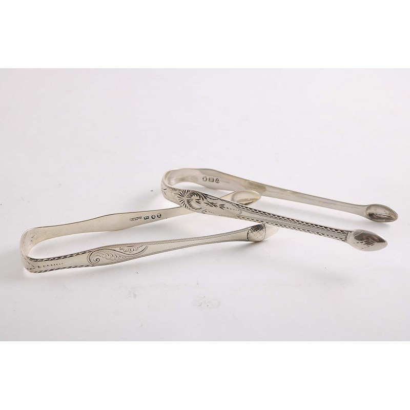 A PAIR OF GEORGE III ENGRAVED SUGAR TONGS by N. Smith & Co., Sheffield 1796 and an engraved Newcastle pair by T. Walton c.1790; 2 oz (2)