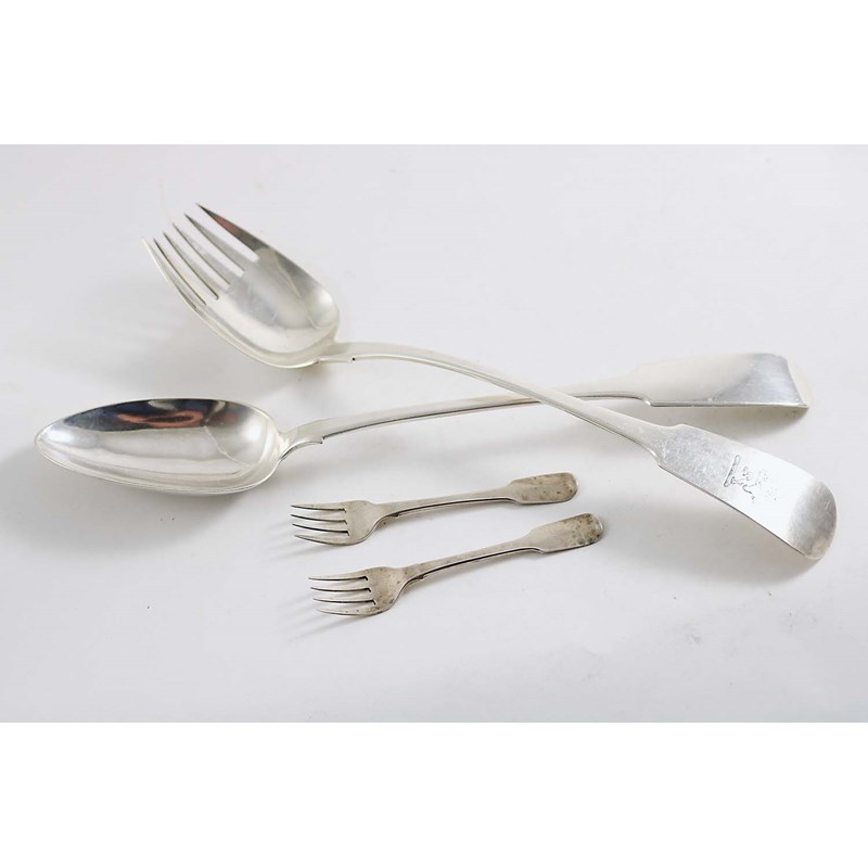 by J. Read (retailed by Neill), Dublin 1836, an Irish Fiddle Rattail pattern serving fork, crested, maker's mark partly worn, Dublin 1821 and a pair of Irish small Fiddle pattern forks, crested, by P. Weeks (retailed by Grays), Dublin 1835; the large fork 12.5" (31.8 cms) long; 11 oz (4)