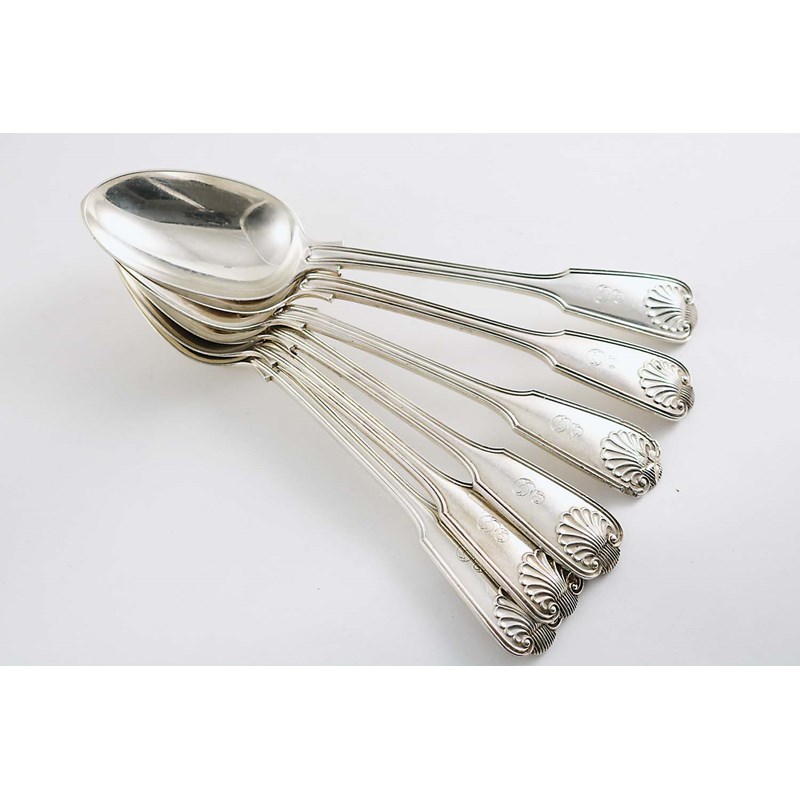 A SET OF SIX VICTORIAN FIDDLE, THREAD & SHELL PATTERN TABLE SOONS (with Diamond Shell heel), initialled "E", by Francis Higgins, London 1883; 20.25 oz (6)