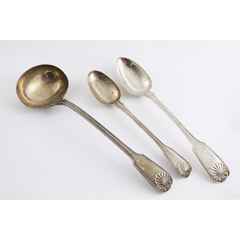 (with Diamond Shell heel) by John James Whiting, London 1850, another slightly smaller example, same pattern, crested by George Adams, London 1863 and a soup ladle, also the same pattern, by Francis Higgins, London 1862; the latter 13.4" (34 cms) long; 20.9 oz (3)