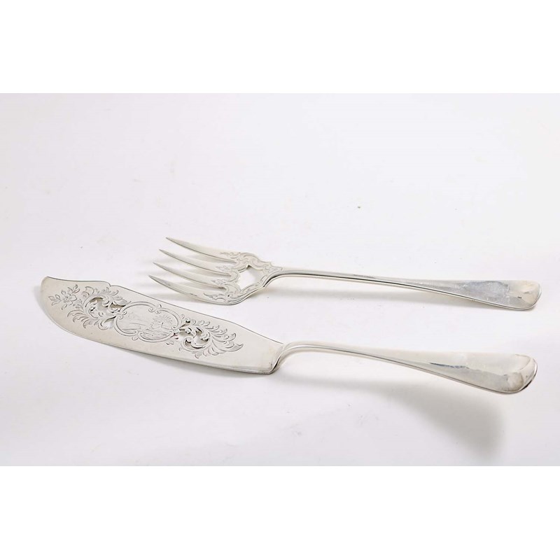 A PAIR OF VICTORIAN OLD ENGLISH PATTERN FISH SERVERS with pierced and engraved blade & tines, by Josiah Piercy, London 1864; the knife 13" (33 cms) long; 10.25 oz (2)