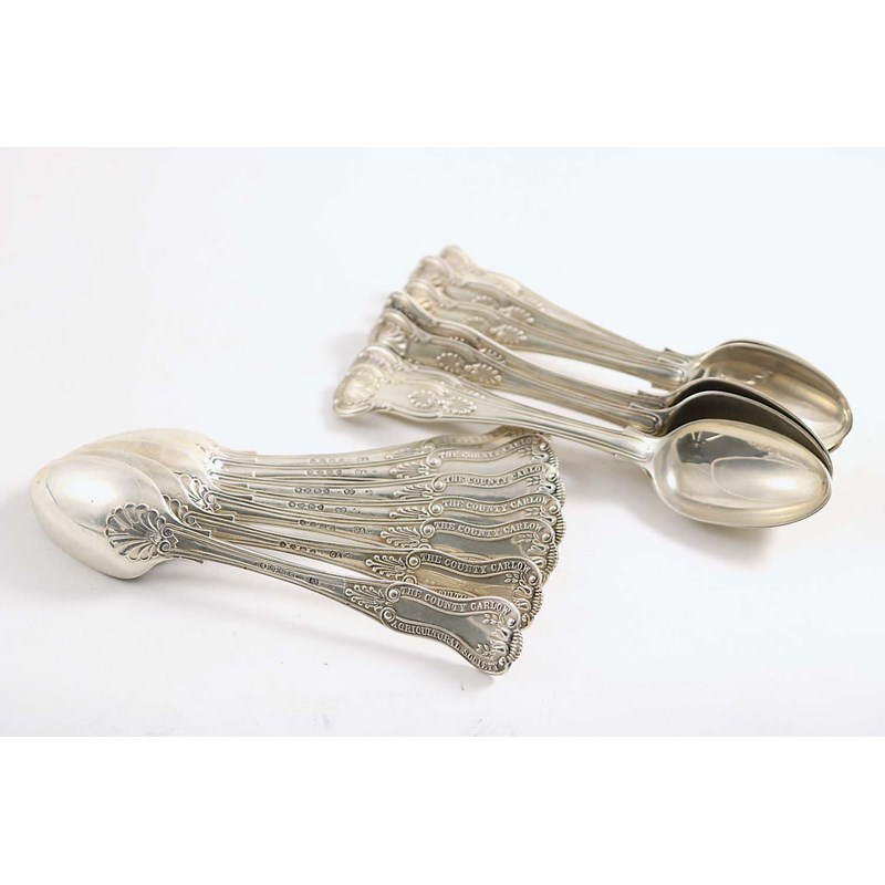 A set of eight Victorian "private die" tea spoons with King's pattern fronts, the reverse incorporating the words "THE COUNTY CARLOW AGRICULTURAL SOCIETY", maker's mark "AW", London 1879/81 together with a set of six similar examples by George Adams, London 1877/80; 15 oz (14)