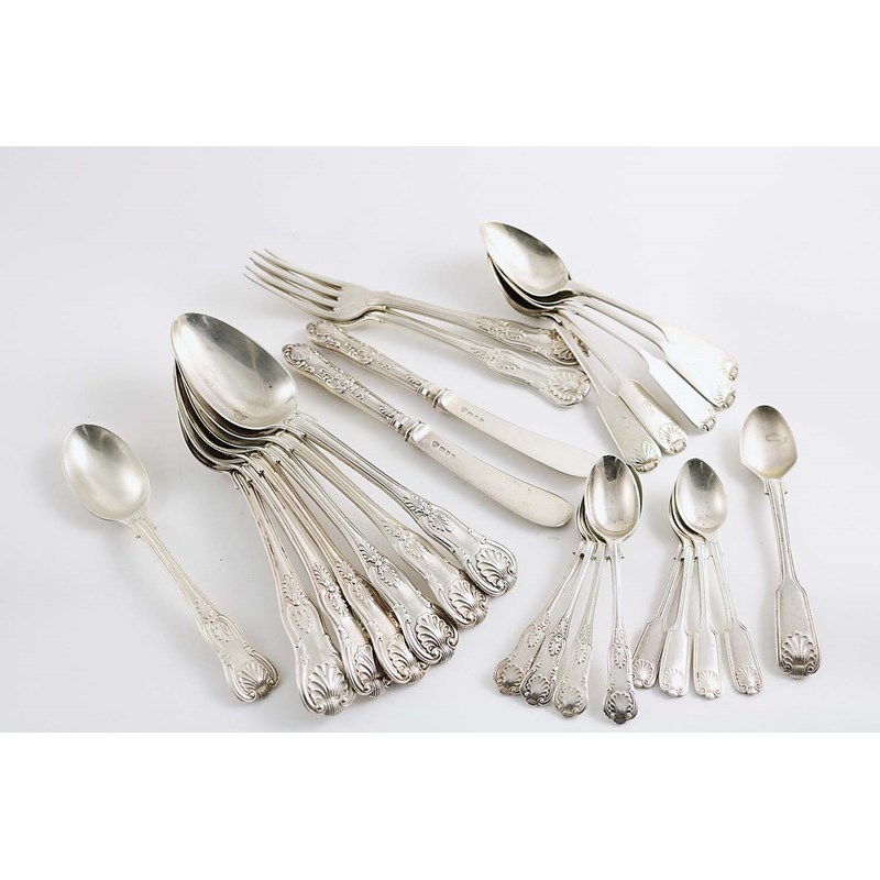 A set of five Newcastle-made tea spoons, initialled, eight coffee spoons, an egg spoon, a tea spoon, two butter spreaders, two antique King's pattern dessert forks and a matched set of six George IV King's pattern dessert spoons by two makers, London 1824/25;  27.5 oz  (25)