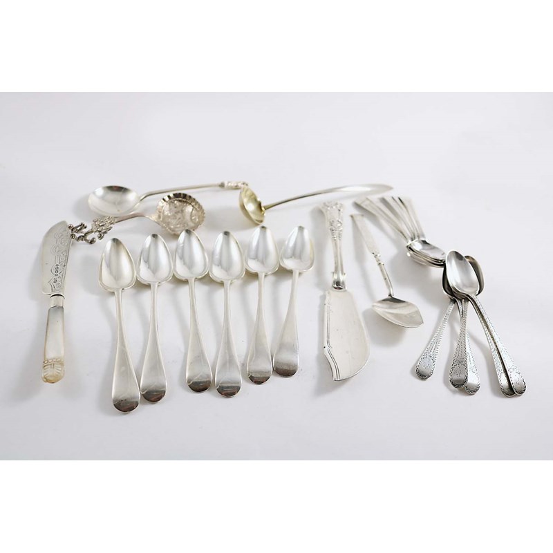 A set of five George III bright-cut tea spoons, initialled, by George Smith, London 1783, another set of five similar, a set of six grapefruit spoons, London 1931, two butter knives, a Dutch spoon, two other spoons and a small American ladle;  the latter 6.2"  (15.5 cms) long;  15 oz weighable silver