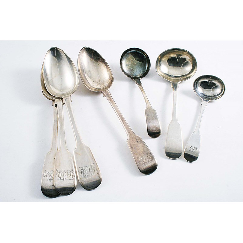 A pair of Fiddle table spoons, initialled, by W.R. Sobey 1833, another by the same maker, same initials, 1836, another, initialled byJohn Stone 1862, a Fiddle sauce ladle by John Osment, 1839, another by Thomas Hart Stone, 1867 and another, initialled, by Thomas Byne 1853; the latter 5.4" (13.4 cms) long; 12.8 oz