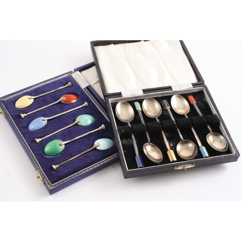 with coloured enamel terminals, by Tandy & Sons, Birmingham 1948 and a cased set of six coffee spoons with coloured enamel on the backs of the bowls by H.C. Davis, Birmingham 1961; 2.6 oz (2)