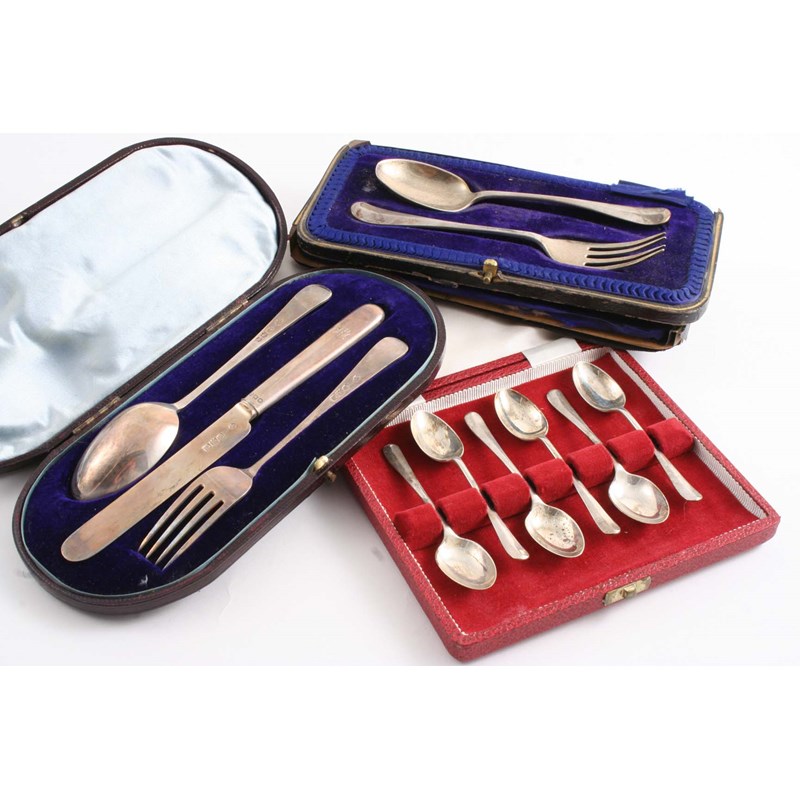 initialled, by Messrs. Hutton & Sons Ltd., London 1896 (cased), a spoon & fork inscribed "Venetia" in a fitted case, and a cased set of six modern coffee spoons; 5.4 oz weighable silver 93)
