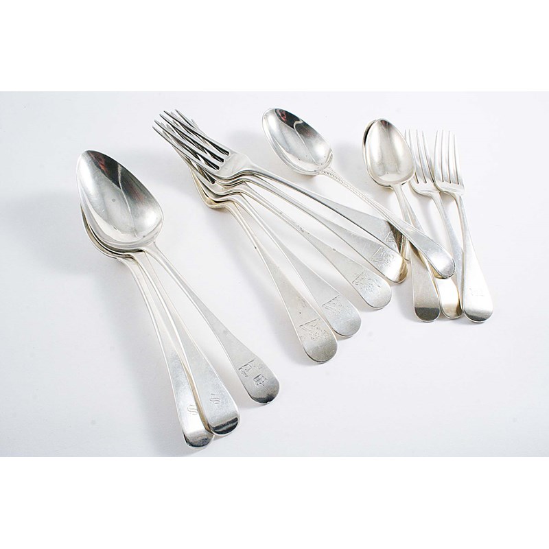 A set of five George III Old English pattern table forks, crested, by Peter, Ann & William Bateman, London 1801, a pair of Exeter-made dessert forks, initialled, a pair of George III dessert spoons, a single table soon, crested, a pair of table spoons, initialled, by S. Hayne & D. Cater, London 1853 and a Feather-Edge dessert spoon; 21.6 oz (13)