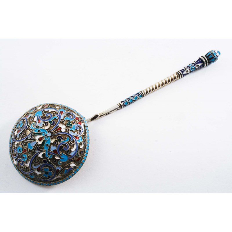 AN EARLY 20TH CENTURY RUSSIAN SILVERGILT & CLOISONNE ENAMELLED SPOON with a round bowl with state marks for 1908-1917; 7.25" (18.5 cms) long; 2.4 oz