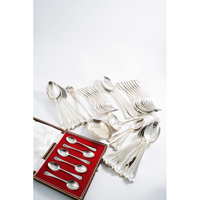 eight dessert forks, three tea spoons, three large table or serving spoons,