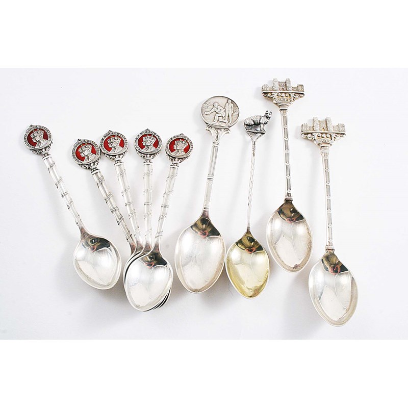 Two souvenir tea spoons "Sham Castle, Bath" by J. Round, Sheffield 1933/389, a set of five Coronation tea spoons with enamelled terminal 1936, a bowls "prize" tea spoon & a tea spoon with a Manx cat terminal, Chester 1919; 3.25 oz (9)
