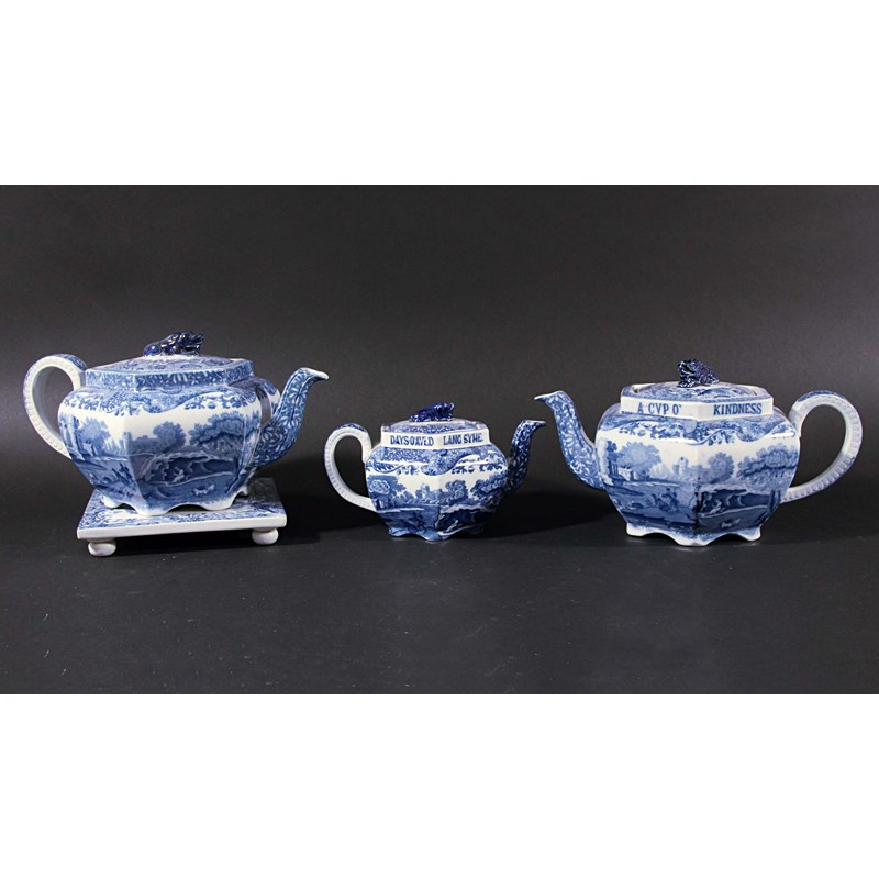 COLLECTION OF SPODE BLUE ITALIAN HEXAGONAL TEAPOTS, including Auld Lang Syne, Polly Put The Kettle On and other items (13)
