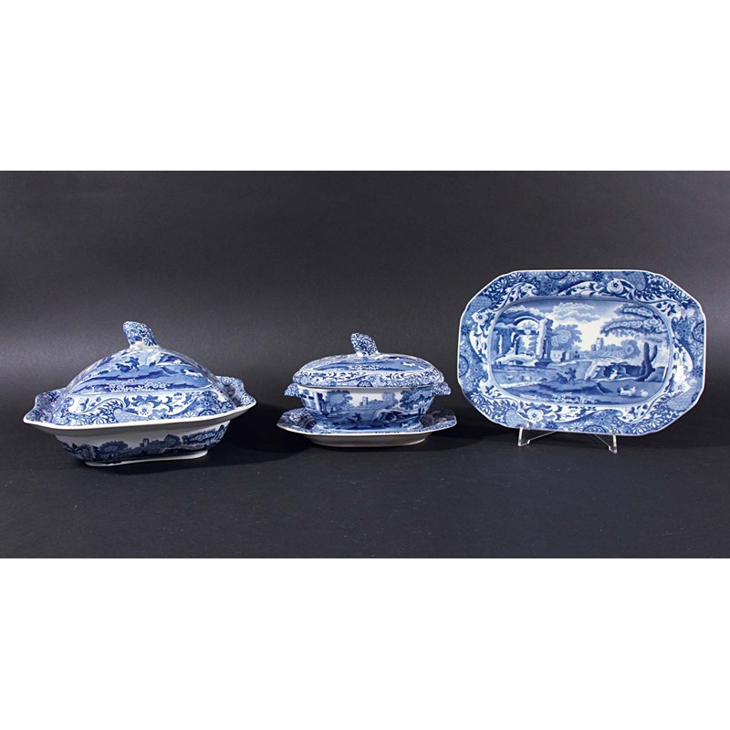 COLLECTION OF SPODE BLUE ITALIAN WARES, including nine platters in various sizes, four vegetable tureens and covers and two sauce tureens, covers and stands (15)
