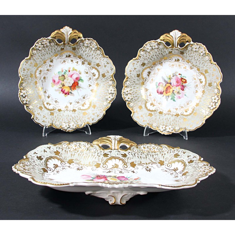 DAVENPORT PART DESSERT SERVICE, mid 19th century, painted with floral bouquets inside grey, gilt and florally moulded and pierced borders, comprising seven plates and two pairs of dishes, printed marks (11)