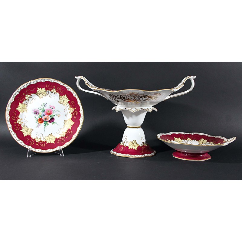 VICTORIAN PART DESSERT SERVICE, painted with floral sprays inside burgundy and gilt borders, comprising a comport, twelve plates and three circular dishes, puce painted 3/2131 (16)