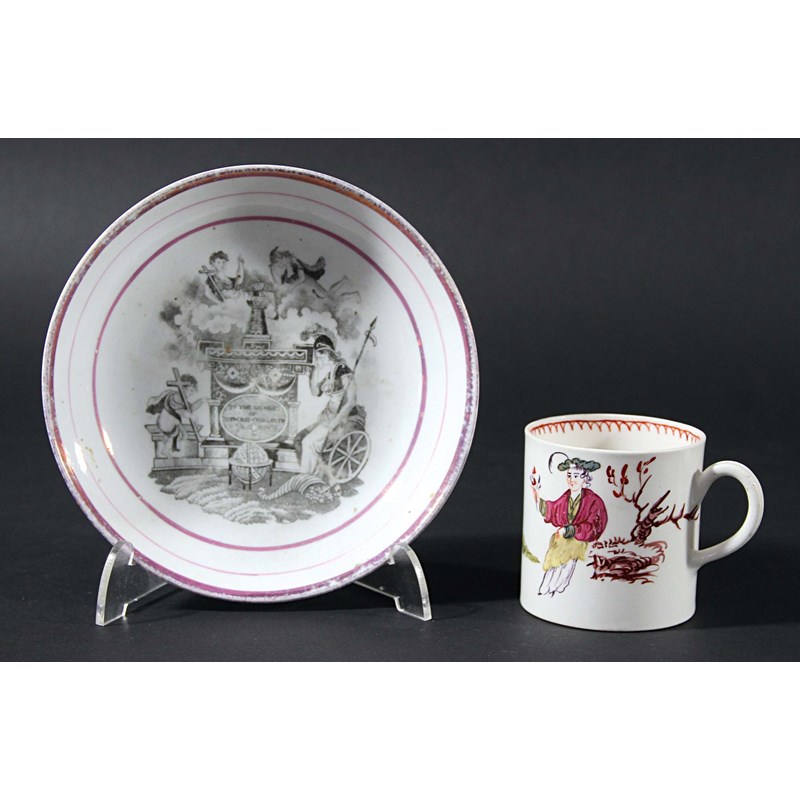 late 18th century, enamelled with a pair of European figures in feathered hats and a Chinese boy, height 6cm; together with a commemorative saucer 'To The memory of Princess Charlotte', with pink lustre border, diameter 14.5cm (2)