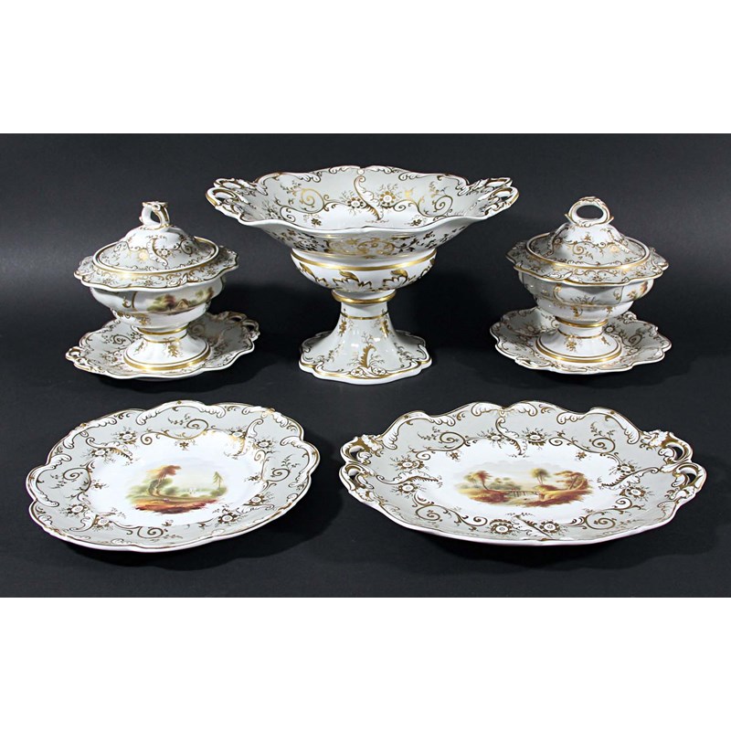 possibly Rockingham, painted with landscapes inside grey and gilt borders with moulded and pierced floral borders, comprising pair of sauce tureens and covers, comport, eleven plates, four rectangular dishes and three oval dishes, iron red 4481 (21)