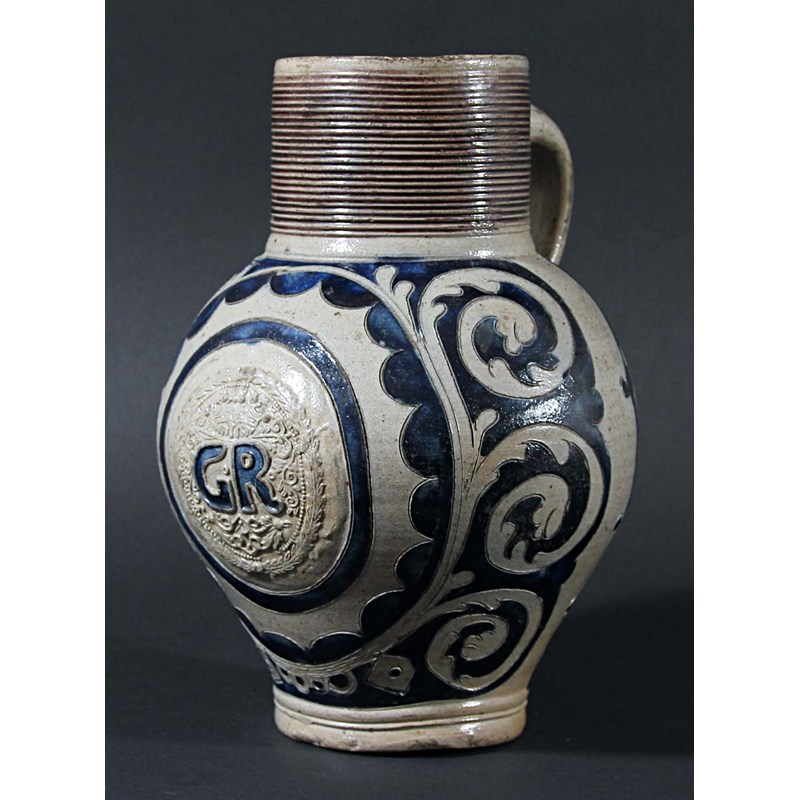 GERMAN WESTERWALD STONEWARE JUG, 18th century, sgrafitto scrolling foliate decoration on blue and manganese around a central GR monogram, height 23cm