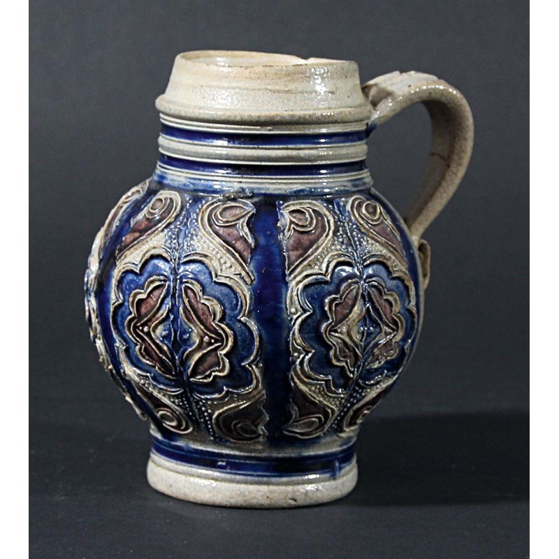 GERMAN WESTERWALD STONEWARE JUG, 18th century, with stylised foliate and floral decoration in relief and under blue and manganese glazes, height 11.5cm