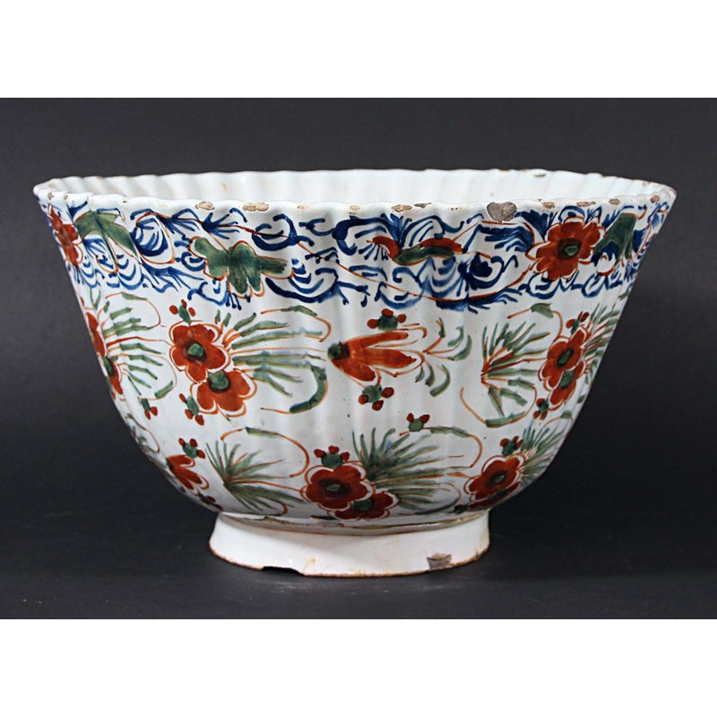 DUTCH DELFT BOWL, late 18th century, of fluted, flaring form with a rounded base and rim foot, painted with flowers, diameter 27.5cm