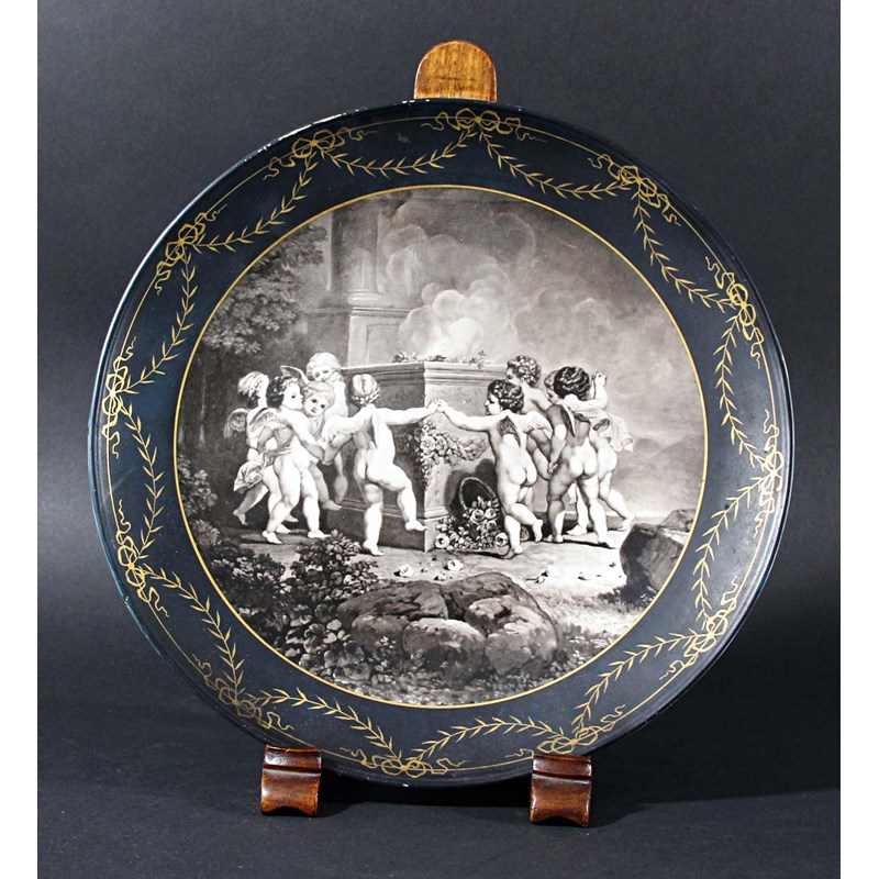 CONTINENTAL PORCELAIN CHARGER, 19th century, painted en grisaille with cherubs dancing around a pyre, the border of gilt swags on a matt black ground, blue printed factory mark, diameter 30cm