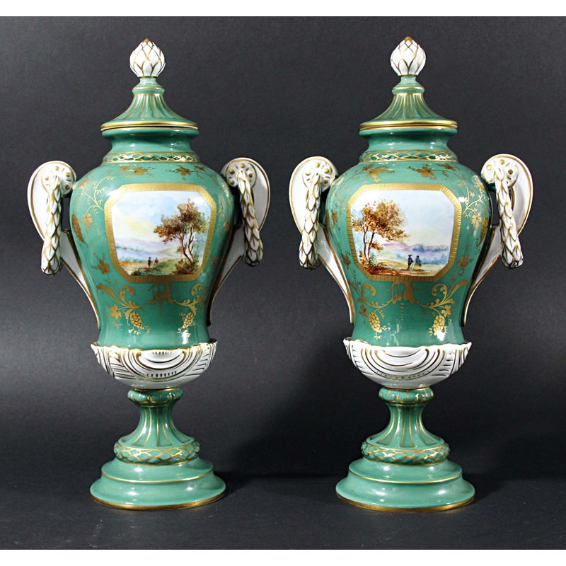 PAIR OF DRESDEN PORCELAIN VASES AND COVERS, 20th century, painted with figures in a rural landscapes on a green ground with gilt highlights, printed marks, height 34cm (2)
