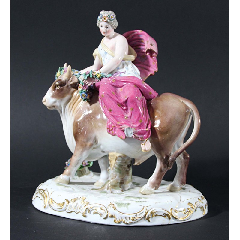 MEISSEN GROUP OF EUROPA AND THE BULL, 19th century, with pink and gilt star gown, blue crossed sword mark, incised K70, height 23cm