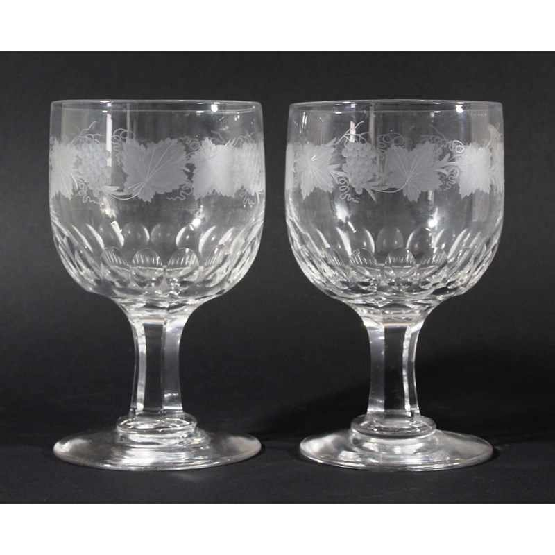 PAIR OF VICTORIAN GLASS GOBLETS, the rounded bowl with faceted base and fruiting vine engraved decoration on a hexagonal stem and spreading foot, height 16cm (2)
