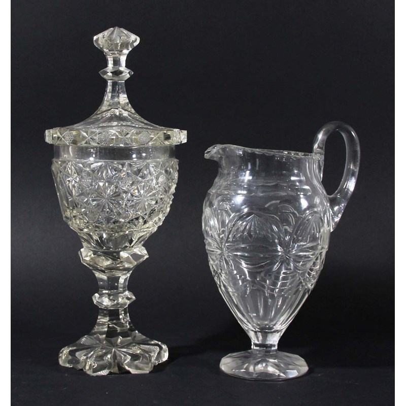GLASS VASE AND COVER, 19th century, a roundel surrounded by cut decoration, knopped stem and hexagonal foot, height 29cm; together with a footed water jug, height 21cm (2)