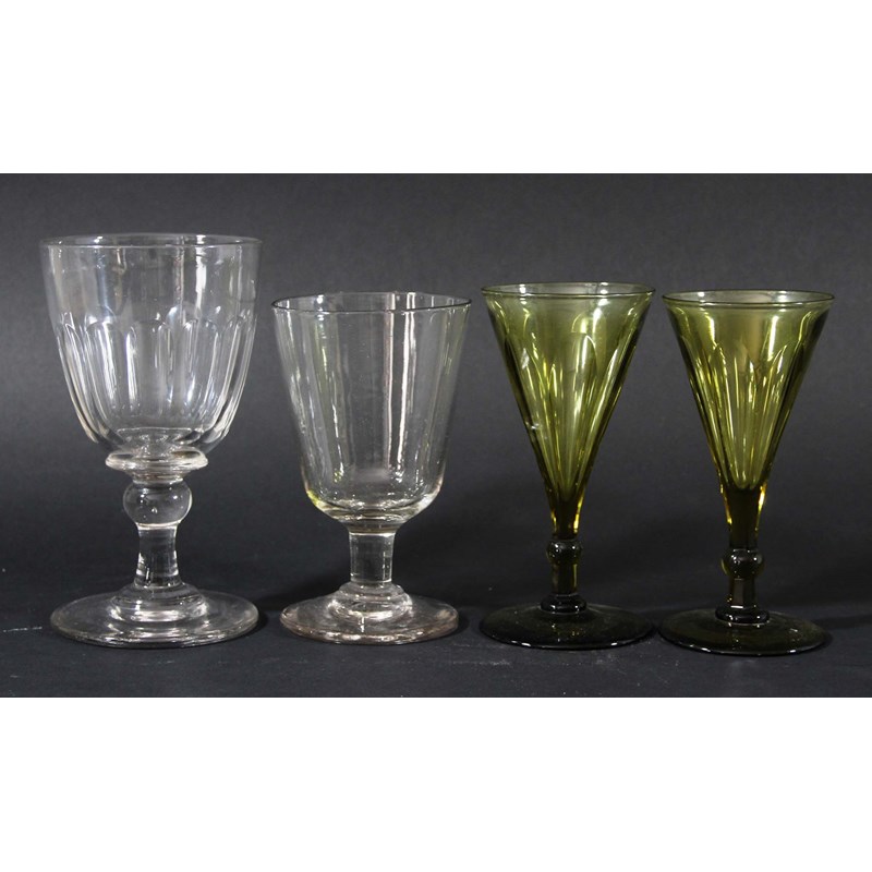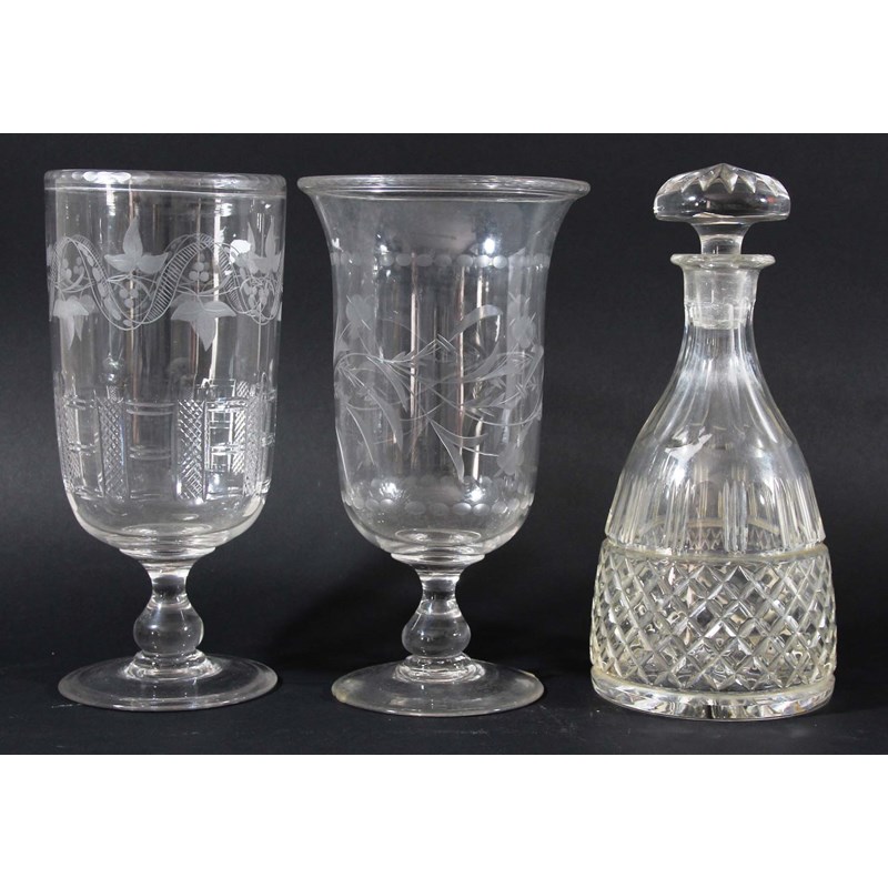 of bell form with folded over rim, baluster stem, spreading foot and engraved floral decoration, height 24cm; together with another with a rounded base, a decanter and stopper, a collection of 19th century rummers and a set of five olive green wine glasses (parcel)