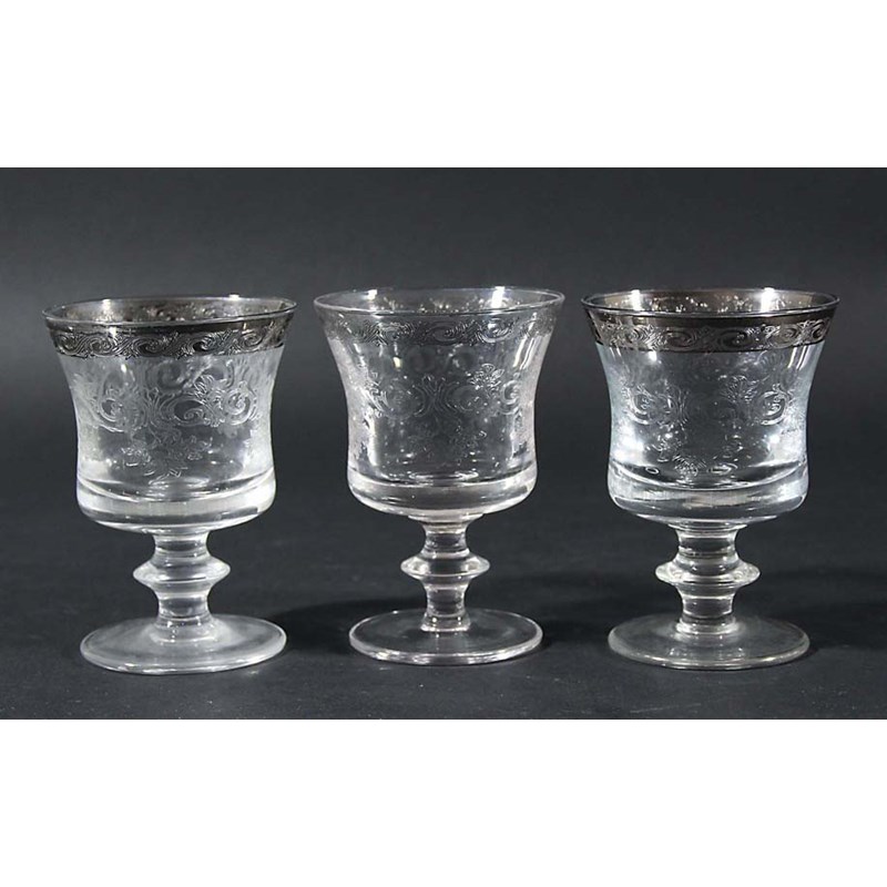 SET OF ELEVEN DRINKING GLASSES, the silvered rim above scrolling foliate decoration, knopped stem and spreading foot, height 10cm (11)