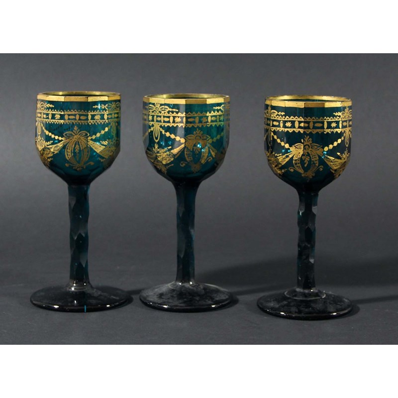 late 19th century, the faceted bowls with gilt swag decoration on faceted stems and spreading feet, possibly matched, heights 14-15cm (12)