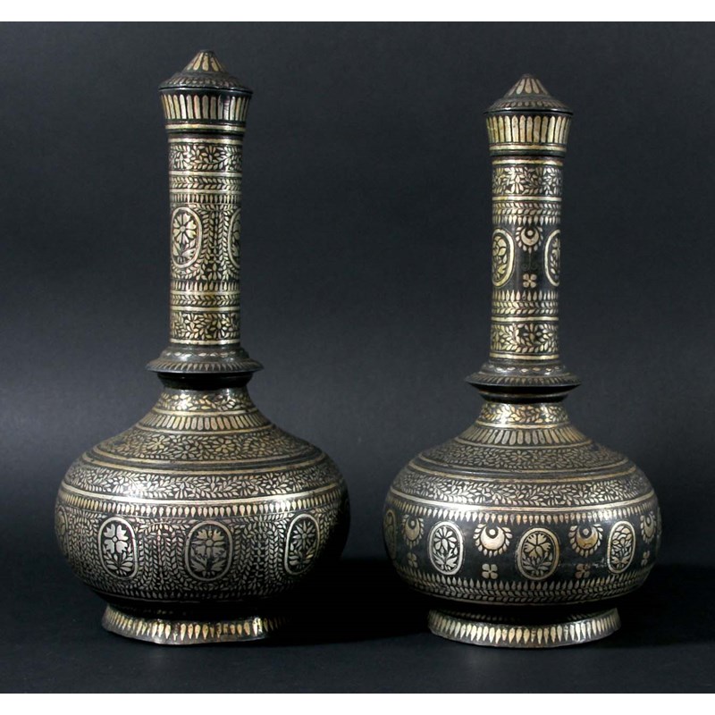 PAIR OF INDIAN BIDRI VASES AND COVERS, 19th century, of bottle form with meandering flowering foliage and flowerhead decoration, height 31cm (2)