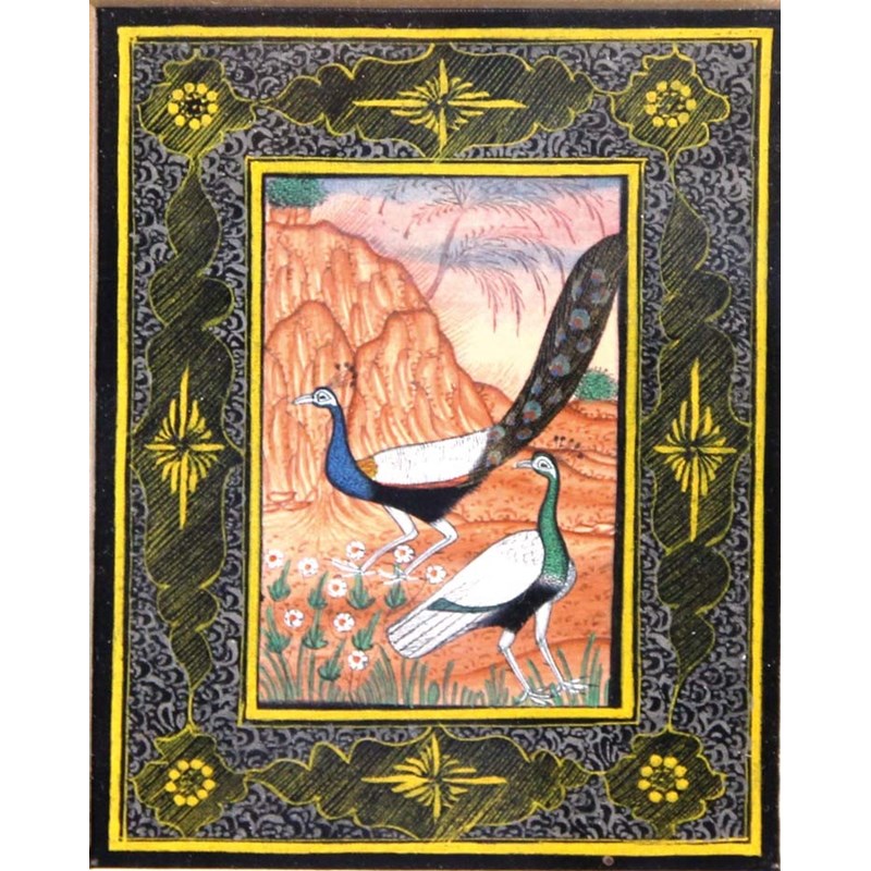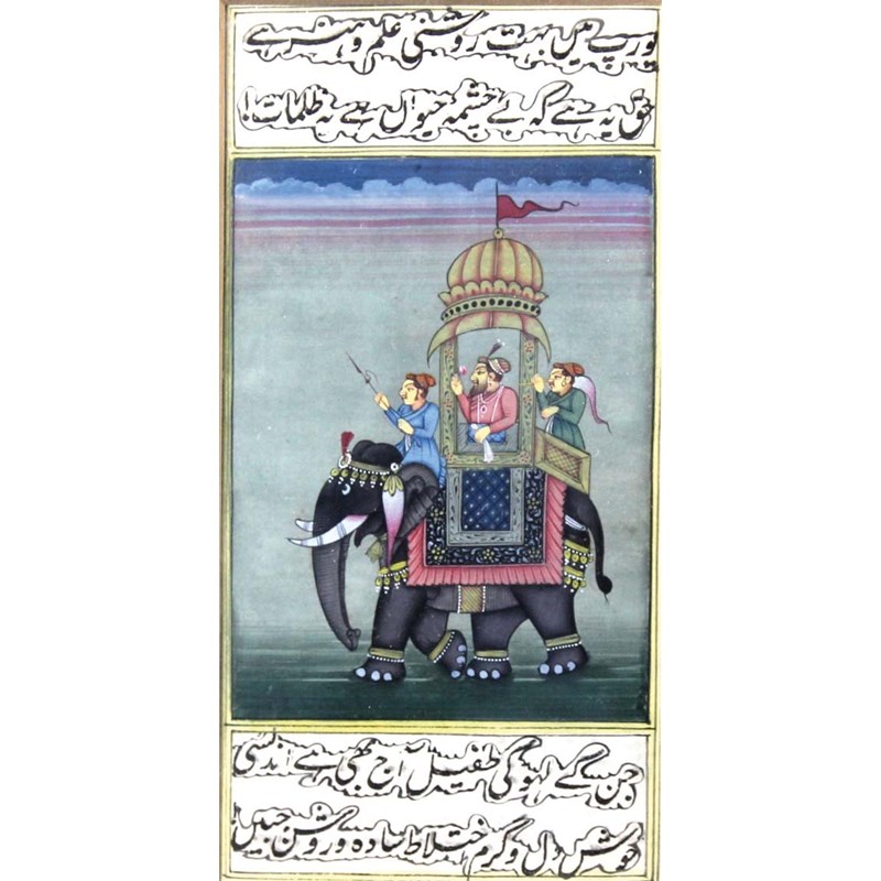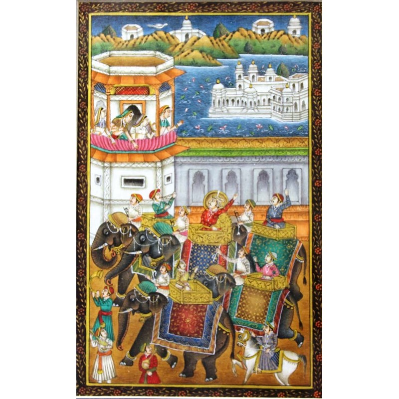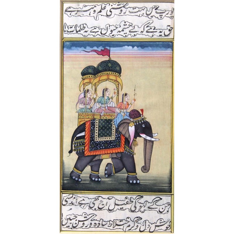 Prince and dignitaries in howdah on elephants before ladies waving from a tower, a palace in a lake beyond, 23cm x 14.5cm; together with a pair of miniatures of men and ladies in howdahs on elephants, 16cm x 8cm; and another of peacocks, 9.5cm x 7.5cm (4)
