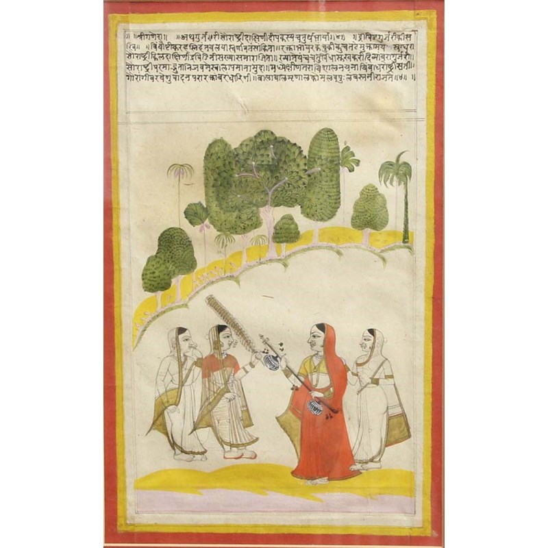 possibly Central India and 18th century, depicting a Raiput ruler on horseback with two attendants, colour and gilt on paper, 30cm x 20cm; together with a pair depicting figures outside a temple and musicians and dancers in a garden, each beneath inscriptions (3)