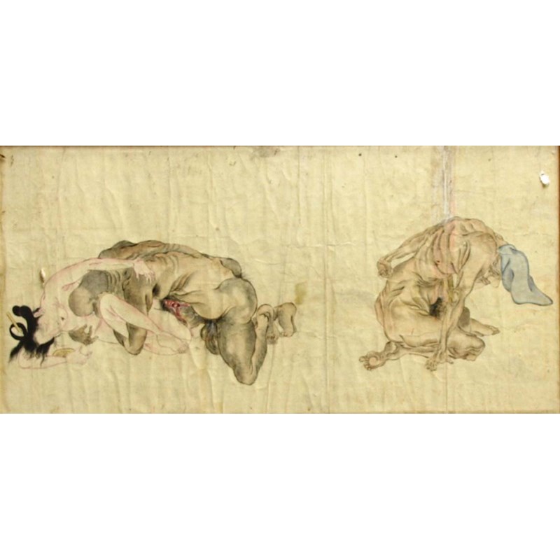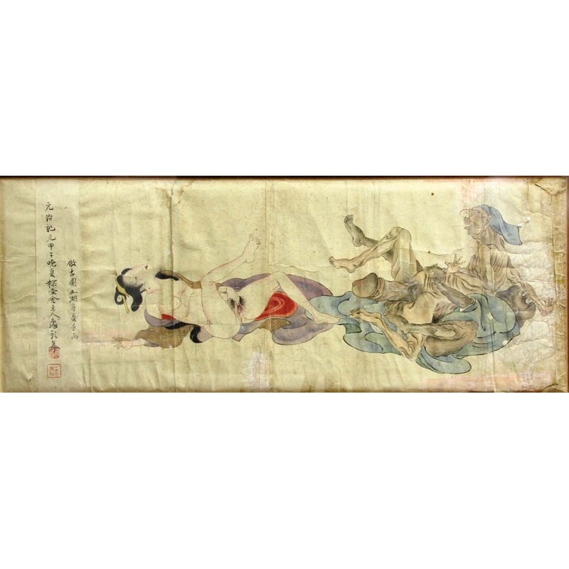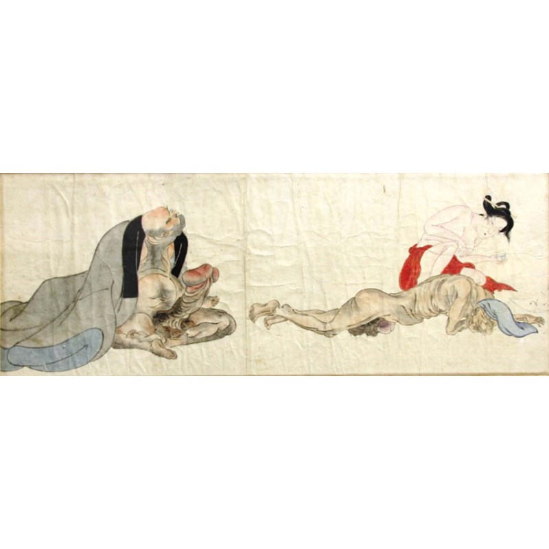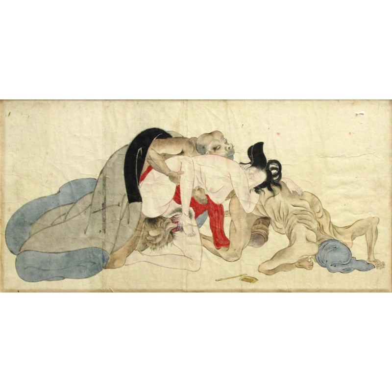 SET OF FOUR JAPANESE SHUNGA WOODBLOCK PRINTS, each one of a maiden and two men in erotic positions, 18th or 19th century, 25cm x 50cm or 25cm x 65cm (4)