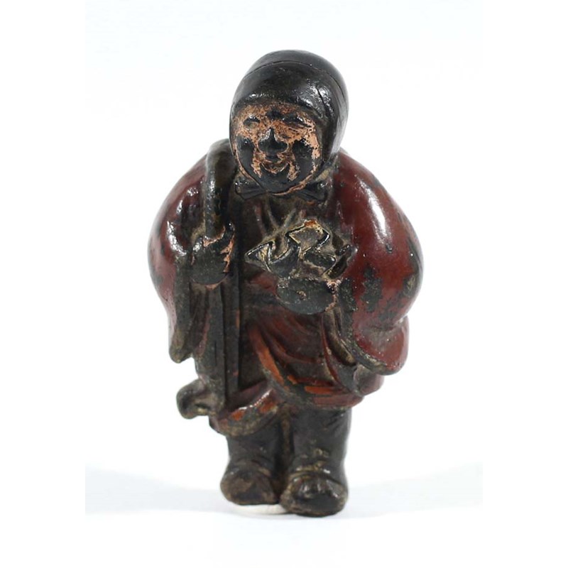 JAPANESE CARVED AND LACQUERED WOODEN NETSUKE OF A TRAVELLER, 19th century, .the hooded figure carrying a dragon in a bag on his back, height 5.2cm